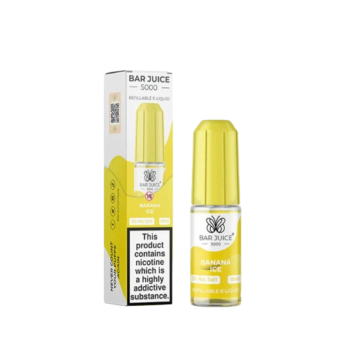 The Bar Juice 5000 Nic Salt – Banana Ice combines the rich, creamy taste of ripe bananas with a refreshing icy exhale. This nicotine salt e-liquid offers a smooth throat hit and fast nicotine absorption, making it perfect for everyday use. Its 50/50 VG/PG blend ensures optimal performance in refillable pod kits and MTL vape devices, producing rich flavor with discreet vapor.