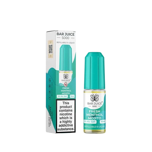 The Bar Juice 5000 – Fresh Menthol Mojito captures the refreshing taste of a classic mojito with its vibrant mix of lime, fresh mint leaves, and a hint of cool menthol. This Nic Salt e-liquid delivers a smooth throat hit and quick nicotine absorption, making it ideal for pod systems and MTL vape devices. Its 50/50 VG/PG ratio ensures balanced flavor and discreet vapor, perfect for vapers who love a fresh, cocktail-inspired vape.